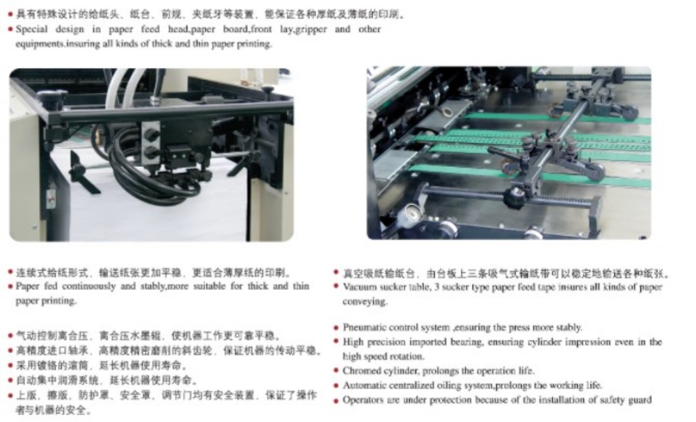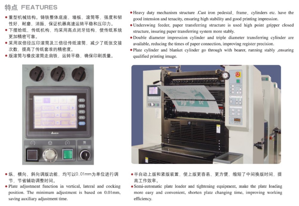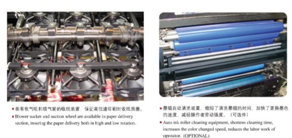 تم تصميم ماكينة طباعة الأوفست الكبيرة ذات أربعة ألوان مقاس A3 بوحدات عالية الأداء، وجميعها ذات جودة عالية - بكرات وتروس عالية الدقة، وآلية تغذية ورق قوية، ونظام تسجيل ورق عالي الدقة، ونظام إمداد حبر ثابت. لقد تم تصميمها لتلبية متطلبات السوق للطباعة الملونة على الأوراق المقطوعة والتي تتميز بالجودة العالية والكفاءة وبأسعار معقولة. لا يتعين عليك الالتزام بسمك ورق واحد فقط، فهو يعمل مع الورق الرقيق (0.04 مم) وحتى الورق المقوى السميك (0.4 مم). هناك أيضًا أداة تحكم تعمل باللمس مع واجهة برمجة بديهية، مما يتيح لك ضبط الإعدادات ومعلمات الطباعة بطريقة ذكية ومباشرة.
